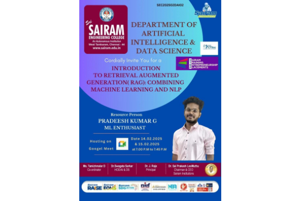 The Artificial Intelligence and Data Science (AI-DS) is an interdisciplinary field that combines Computer Science, Mathematics and Statistics to create intelligent System that can learn from data. The main goal of the department is to develop algorithms, tools and techniques that enable machines to perform tasks that typically require human intelligence such as language understanding, Image recognition and decision making. The department utilizes Machine Learning,Natural Language Processing, Deep learning other advanced technologies to build intelligent systems that can make predictions, analyze data and automate process