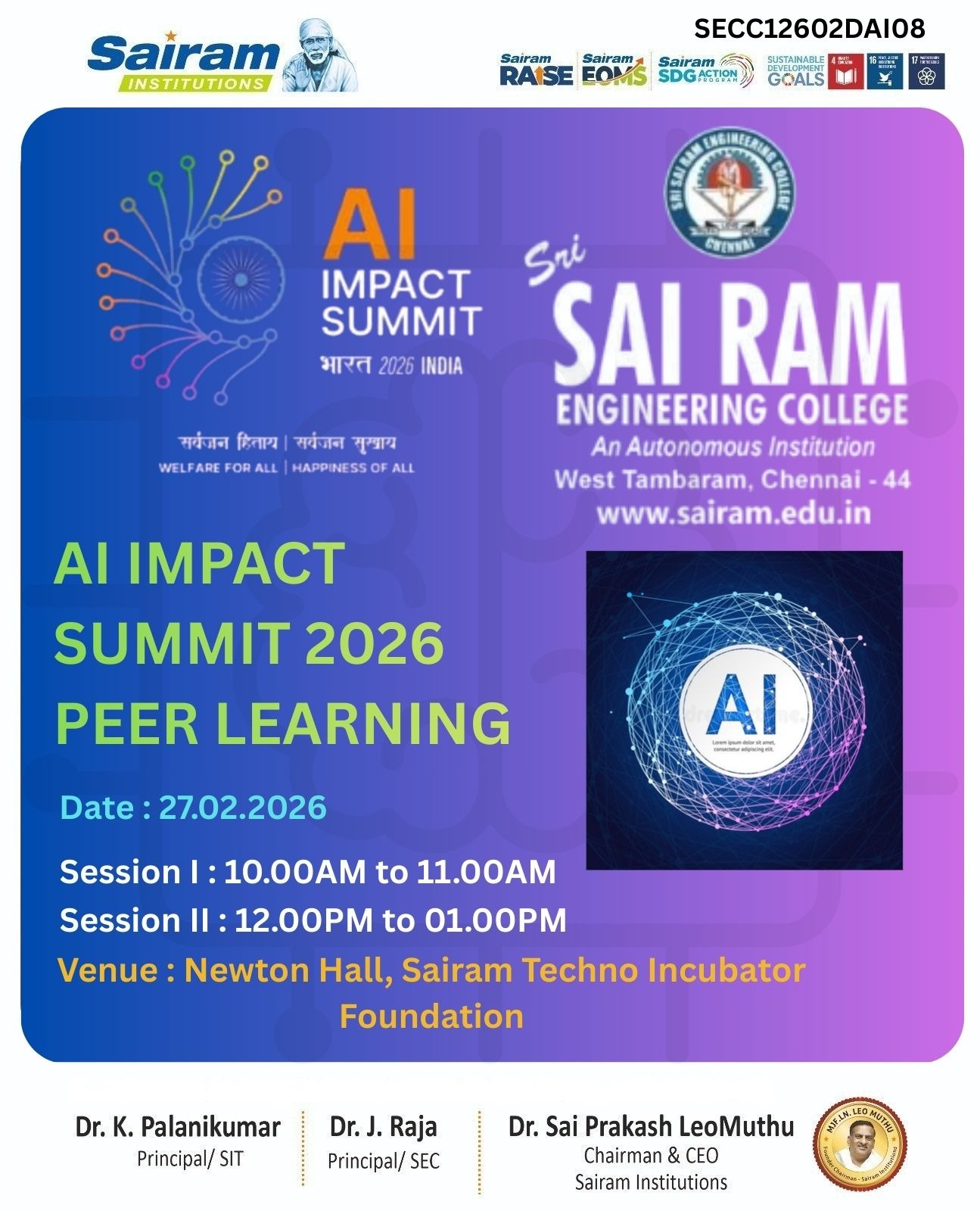 “AI IMPACT SUMMIT 2026 PEER LEARNING ” to be held in Sri Sairam Engineering College on 27.02.2026 at Newton hall.
