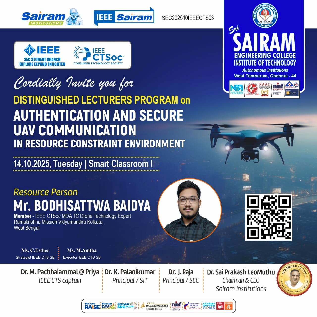 “Authentication and Secure UAV communication in Resource constraint development” to be held in Sri Sairam Engineering College at Alpha Hall on 14.10.25 at Smart Classroom of Sri Sairam