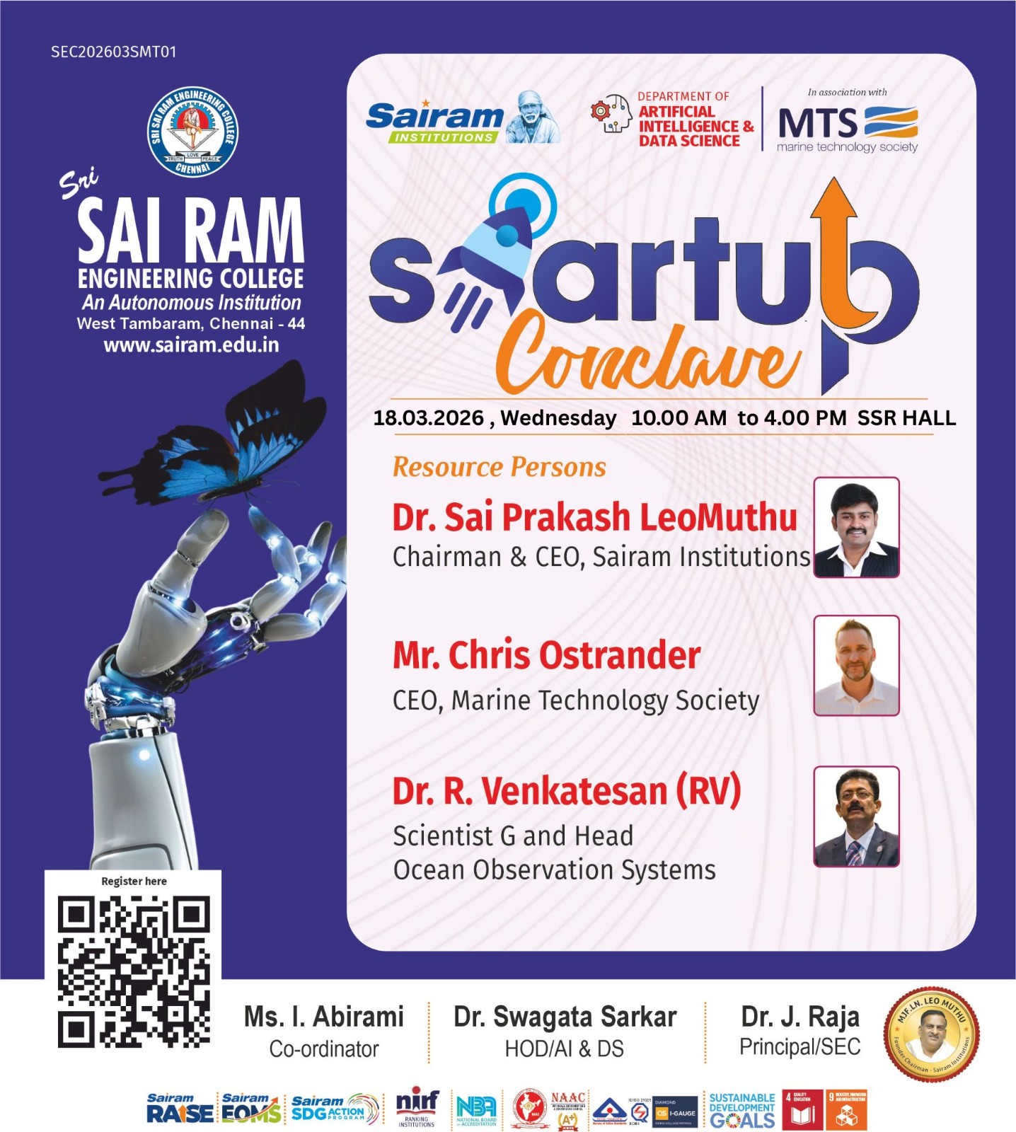 Start up Conclaveto be held in Sri Sairam Engineering College on 18.03.2026 at SSR Hall from 10 am to 4.00 pm.